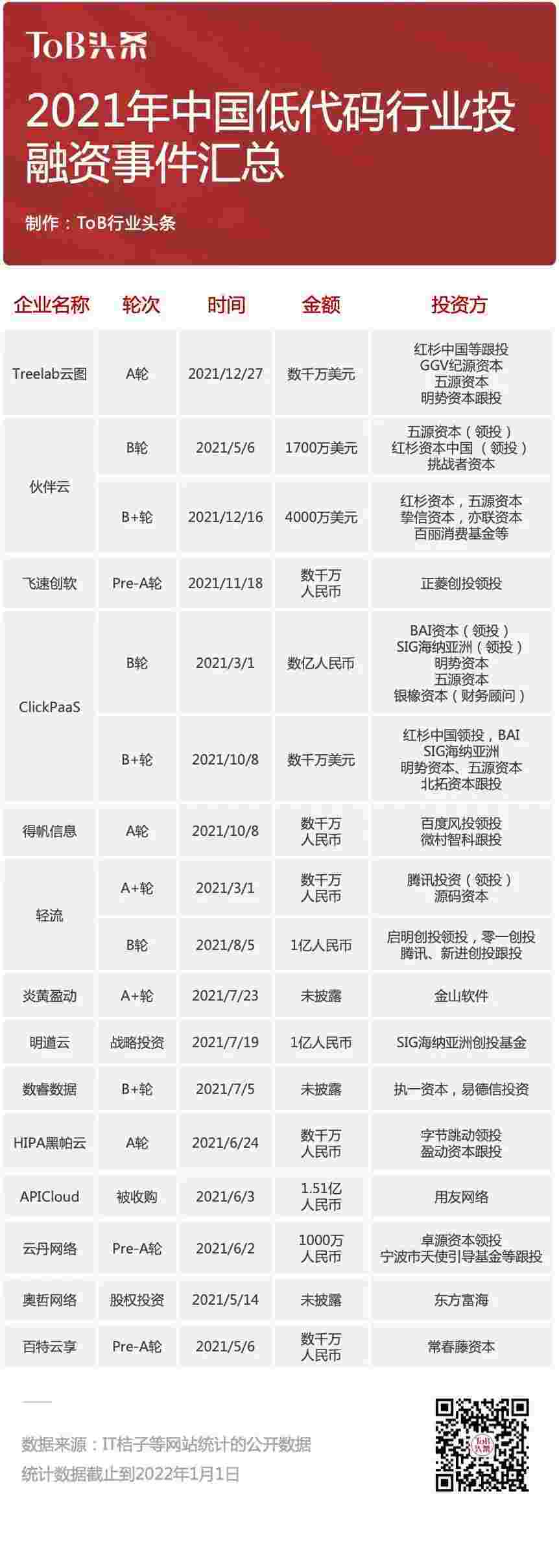 到2021年,,无/低代码投融资规模势头更甚,,,其中包括轻流两轮融资(A+轮数千万人民币,,,B轮近亿人民币)、、GOPAY钱包 两轮融资(B轮数亿人民币,,,B+轮数千万美元)、、、、百特云享数千万元Pre-A轮融资......